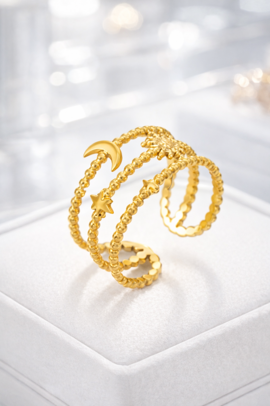 De Celestia Trinity Ring is een verfijnde, verstelbare ring die direct voelt als een juweliersstuk en niet als “accessoire”. Drie slanke kralenbanden bewegen losjes om elkaar heen en worden subtiel geaccentueerd door maan-, ster- en zonbedels. Het ontwerp speelt met textuur en symboliek, maar blijft clean en draagbaar. De open constructie maakt de ring volledig adjustable, waardoor hij zich moeiteloos vormt naar elke vinger zonder in te leveren op comfort. Lichtgewicht, elegant en perfect in balans tussen speels en sophisticated. Ideaal als statement op zichzelf, maar ook sterk als verfijnde basis in een moderne ring stack.